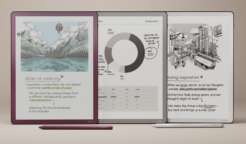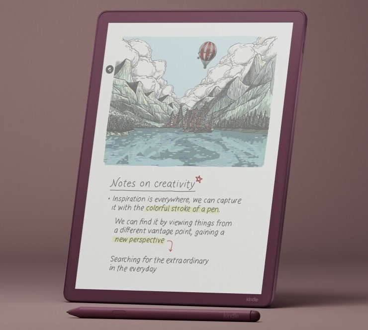 Модель Kindle Scribe Colorsoft (2025), в свою очередь, получила 11-дюймовый цветной дисплей на электронных чернилах. Сама Amazon отмечает, что эта новинка оснащена технологией отображения, которая создаёт мягкие цвета, не раздражающие как ЖК-дисплеи глаза. Компания также разработала новый движок рендеринга, улучшающий цветопередачу и обеспечивающий быстрое и естественное письмо. Устройство позволяет художникам создавать плавные градиенты и тонкие тона с помощью нового инструмента шейдеров. Пользователи могут писать, рисовать и делать пометки одним из 10 цветов пера или выделять текст маркером одного из пяти цветов. Для Kindle Scribe Colorsoft заявлена автономность в несколько недель. Планшет будет доступен по цене от $629,99.