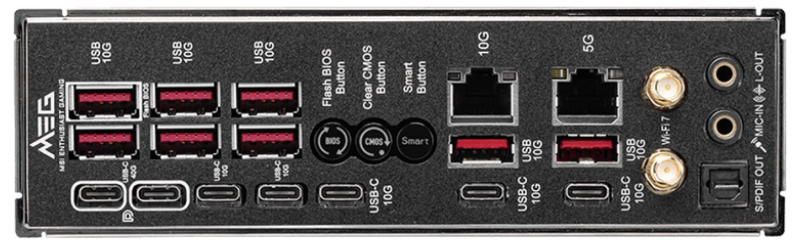 Сетевые возможности плате обеспечивают 10-Гбит и 5-Гбит сетевые контроллеры, а также поддержка Wi-Fi 7 и Bluetooth 5.4. Плата получила 25 портов USB (четыре USB 2.0 и четыре USB Type-A 5 Гбит/с спереди, восемь USB Type-A 10 Гбит/с и пять USB Type-C 10 Гбит/с сзади, по одному USB Type-C на 10 и 20 Гбит/с сзади, а также два USB4 40 Гбит/с сзади). Производитель также выделяет использование чипа BIOS ёмкостью 64 Мбайт для обеспечения поддержки будущих процессоров. Кроме того, плата оснащена 3,99-дюймовым съёмным экраном Dynamic Dashboard III для отображения информации о системе, а также механизмами быстрой установки и демонтажа комплектующих EZ DIY.