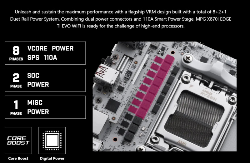 В конструкции MPG X870I Edge Ti Evo WiFi используется 12-слойный текстолит. Плата оснащена двумя слотами DIMM для модулей ОЗУ общим объёмом до 128 Гбайт. Производитель заявляет поддержку оперативной памяти DDR5 со скоростью до 10 000 МТ/с посредством разгона.