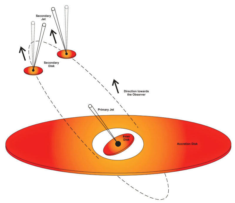 Наблюдение позволило сравнить данные с моделью, показав полное совпадения теории и практики. Ключевым открытием стало обнаружение «виляющей» струи частиц от меньшей чёрной дыры, джет которой гулял в пространстве как хвост собаки под действием центробежных и гравитационных сил в процессе движения меньшей чёрной дыры вокруг своей огромной партнёрши по системе. Наблюдаемое явление, которое для наглядности также можно сравнить с закручивающейся струёй из садового шланга, объясняет динамику системы и позволяет прогнозировать будущие изменения.