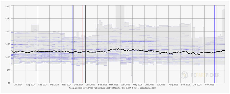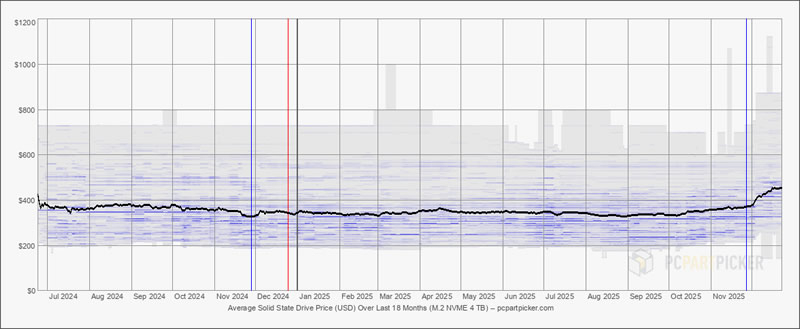 Ещё интереснее сравнение с NVMe-накопителями. Так, 4-Тбайт SSD Crucial P310 на базе PCIe 4.0 стоит около $341 (примерно 26 500 рублей), то есть лишь немного дороже внешнего USB-накопителя, но при этом обеспечивает существенно большую производительность. Как показывают графики на сайте PCPartPicker, за последние 18 месяцев цены на 4-терабайтные SATA SSD не снижались так активно, как на NVMe и внешние SSD. Наоборот, сейчас они растут вместе с ценами на более быстрые типы хранилищ, а SATA утрачивает свою главную выгоду в виде более низкой стоимости.