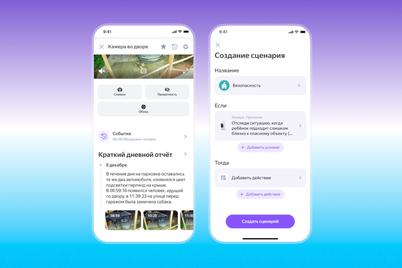Теперь обо всём происходящем в кадре камера «Яндекса» сообщает человеку — она может конкретно определить, что, к примеру, вернулись домой дети; все эти записи сохраняются в архиве, чтобы можно было оперативно найти интересующее. Распознанные ИИ события в кадре можно привязывать к сценариям умного дома — их можно задать своими словами в приложении «Дом с Алисой». Так, если ребёнок просыпается ночью, включается ночник; когда появляется собака, включается автоматическая поилка; а если домашнее животное запрыгивает на диван, снимок отправляется владельцу. Каждый день ИИ генерирует составленную из описаний сводку событий за день и отправляет уведомление через приложение «Дом с Алисой» — посмотреть отчёт можно в карточке устройства.